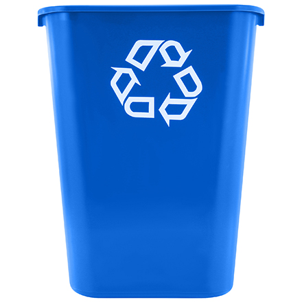 Recycling symbol molded onto the plastic distinguishes this recycling container from other trash cans.